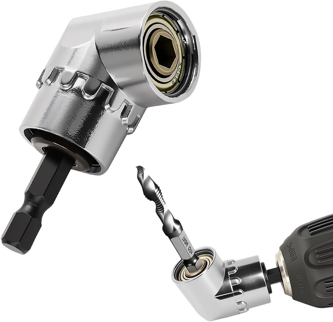 Design curvo de 105 graus:  O adaptador de furadeira de 105 graus se conecta a uma furadeira elétrica, furadeira sem fio ou chave manual, permitindo que ela alcance espaços fechados inacessíveis e aperte os parafusos.